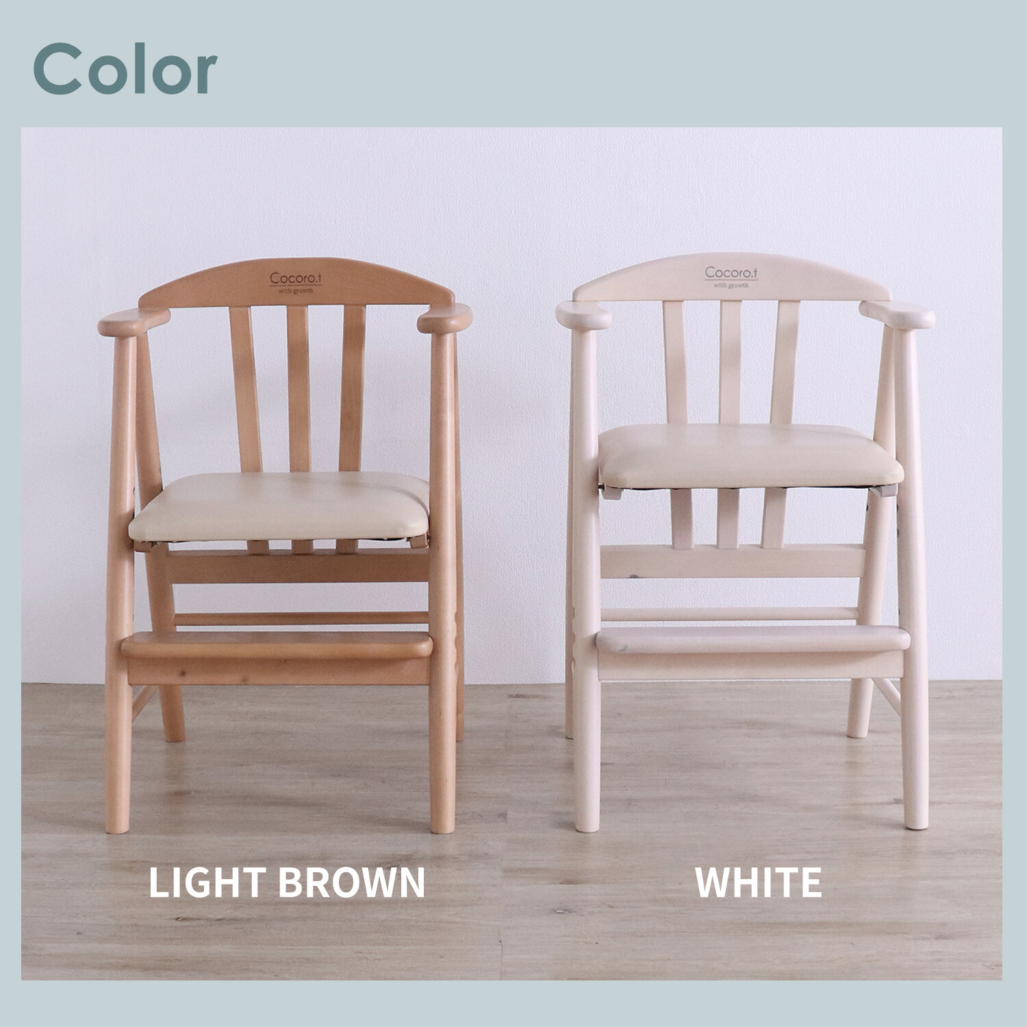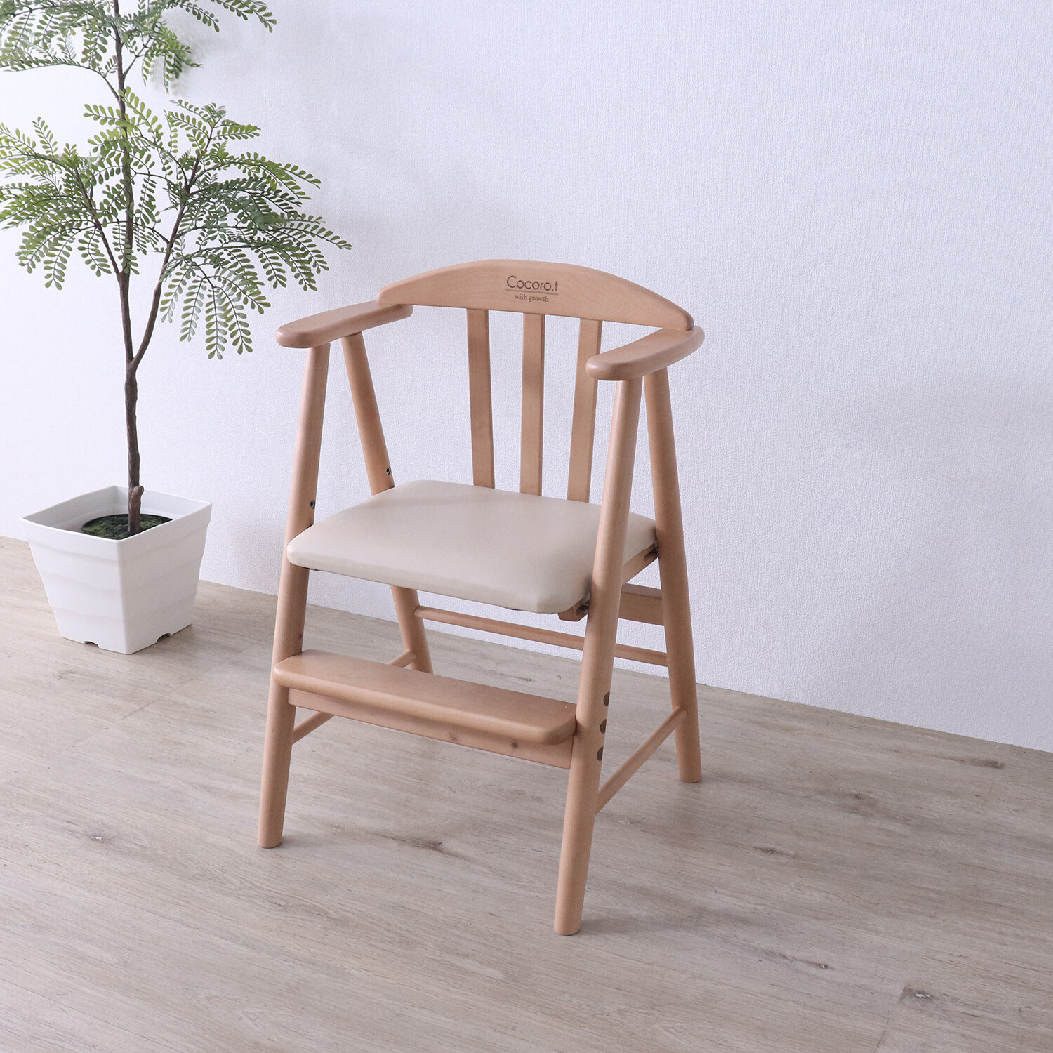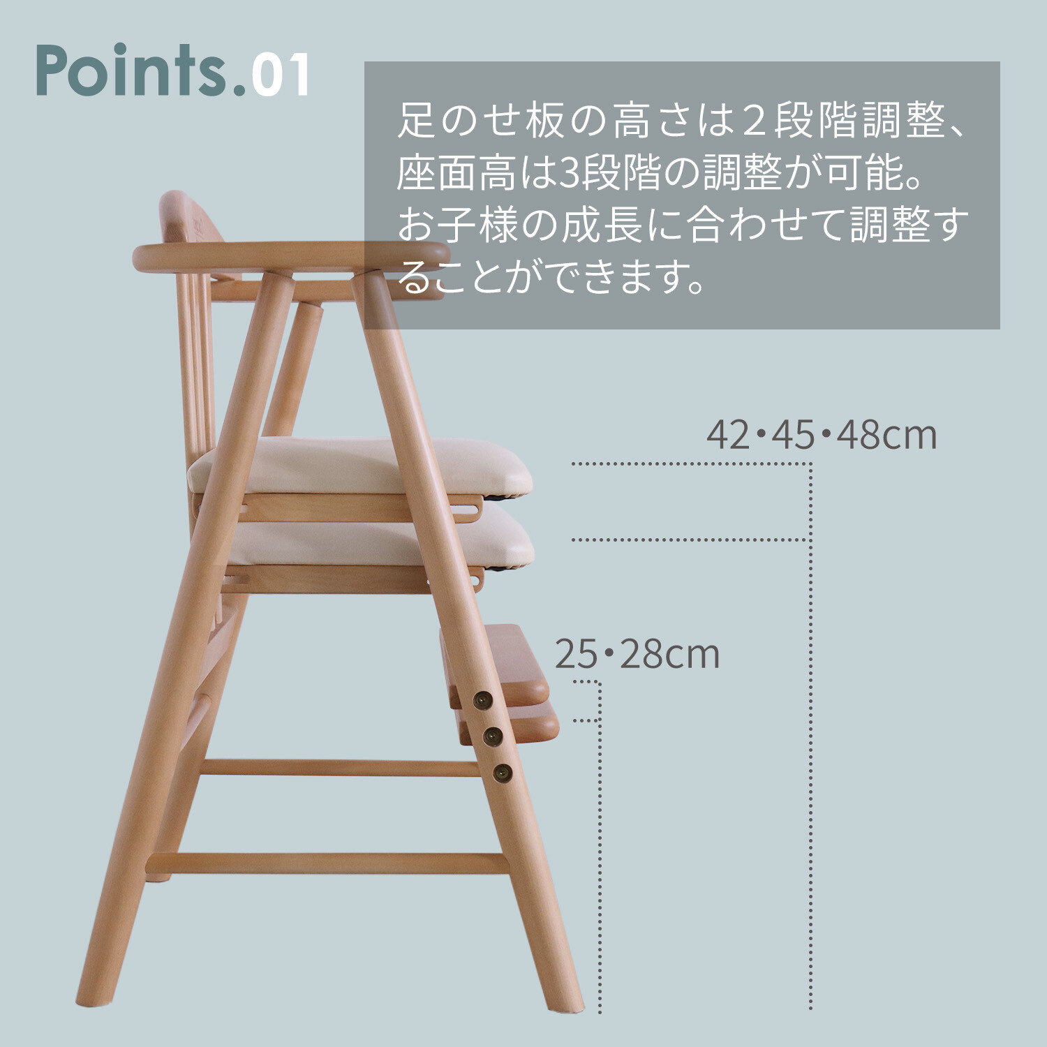 02.座面高は3段階、足のせ板は2段階に調整可能。お子様の成長に合わすことができます。